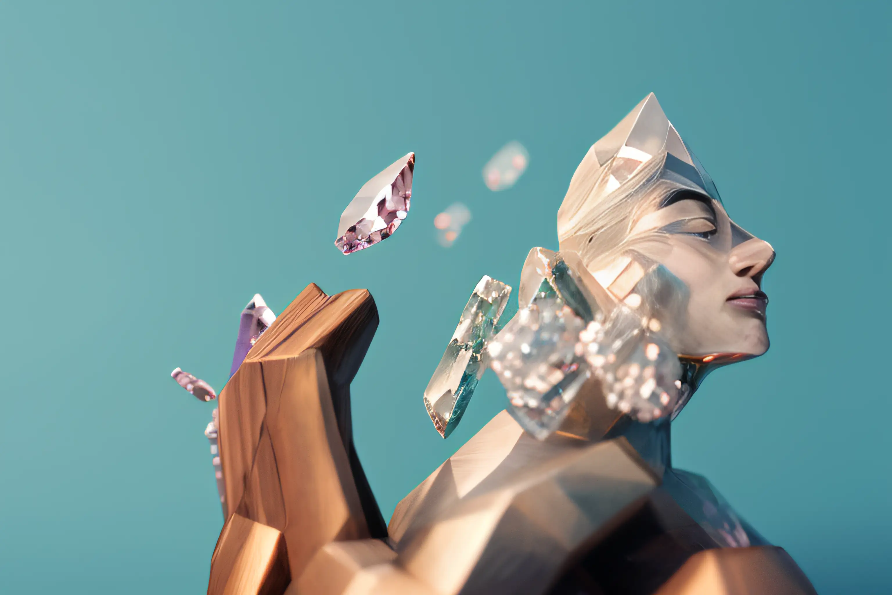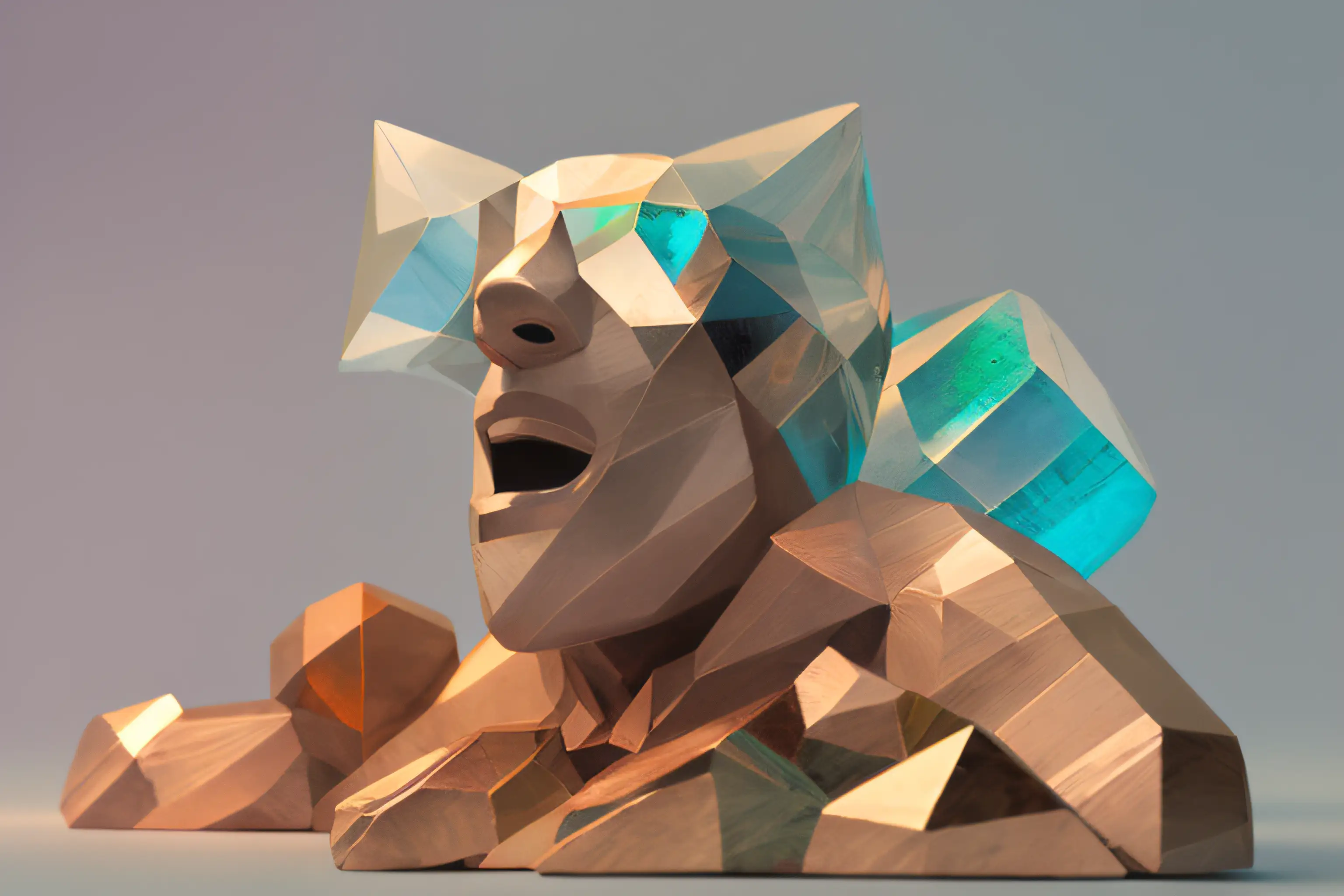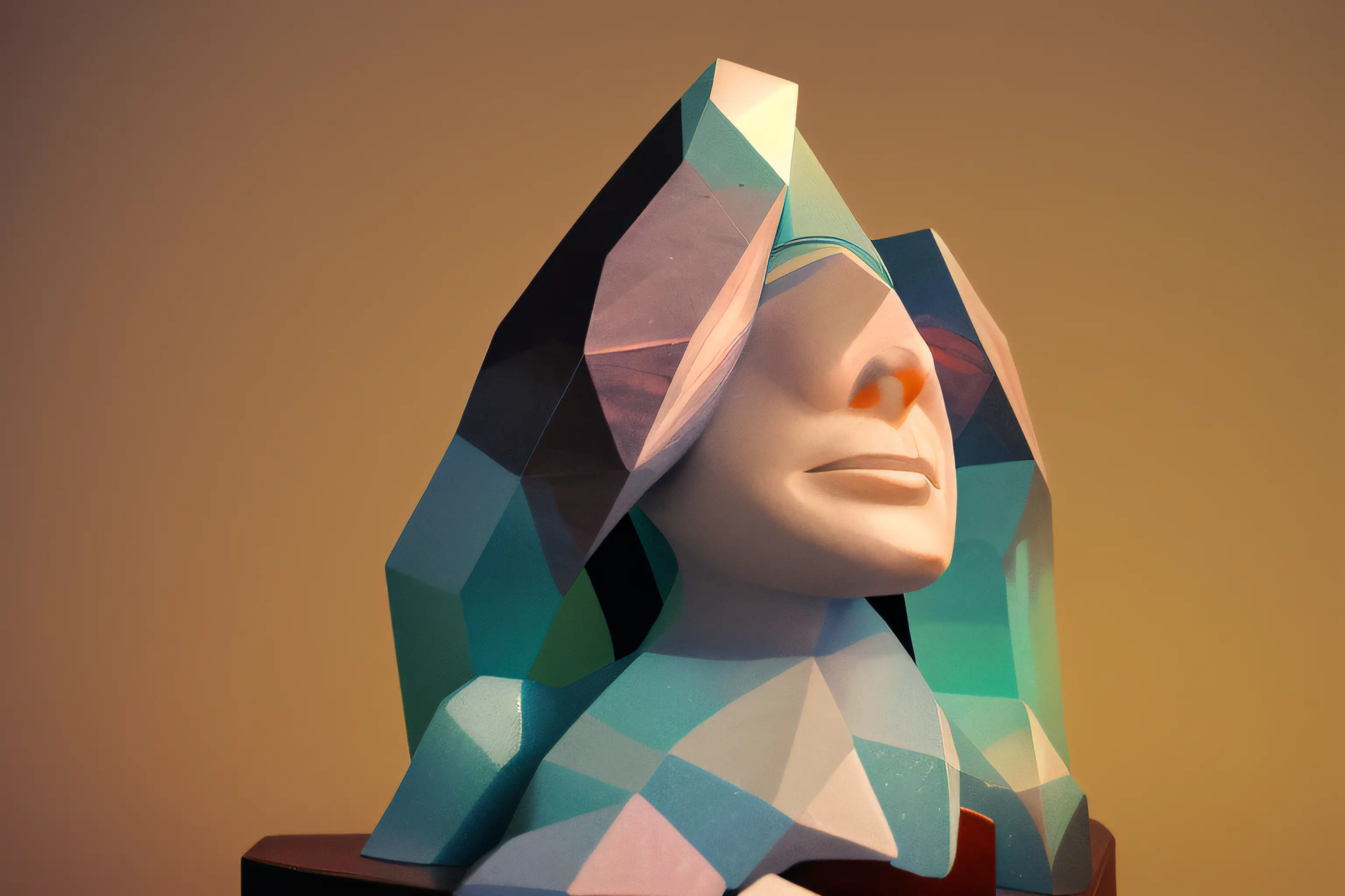 "Sentience Inanimate" offers a transcendental visual saga where the ordinary bounds of sculpture are reimagined into a living narrative of complex geometric morphs. Each piece in the series embodies a unique consciousness, articulated through the intricate interplay of crystalline facets and human-like forms. From the gentle emergence of thought in the assertive stance of unyielding resolve, the sculptures stand as monuments to the myriad aspects of sentient existence.